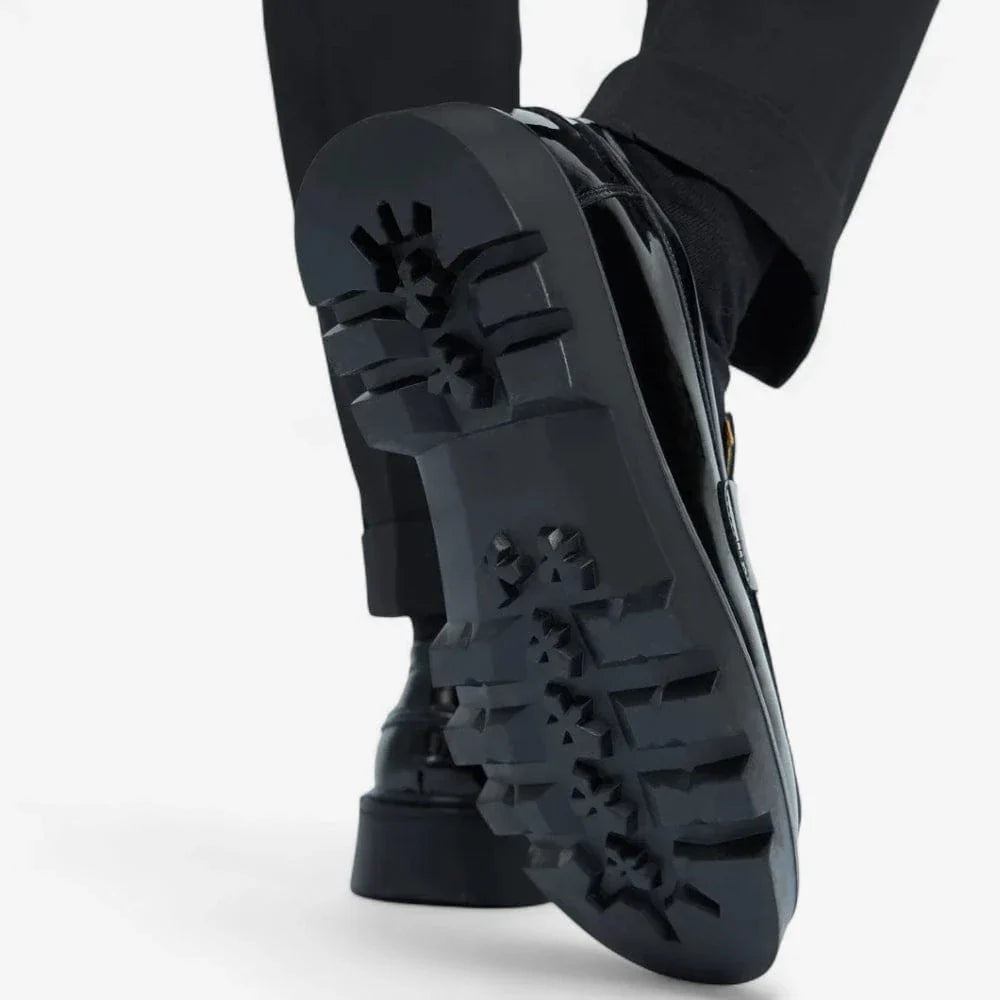 Affichez une allure remarquable et pleine de caractère. Ces mocassins homme en cuir vernis noir à glands et semelle plateforme incarnent l’élégance contemporaine alliée à un confort maîtrisé. Pensés pour l’homme moderne, ils apportent une touche sophistiquée à chaque silhouette, du bureau aux sorties habillées.